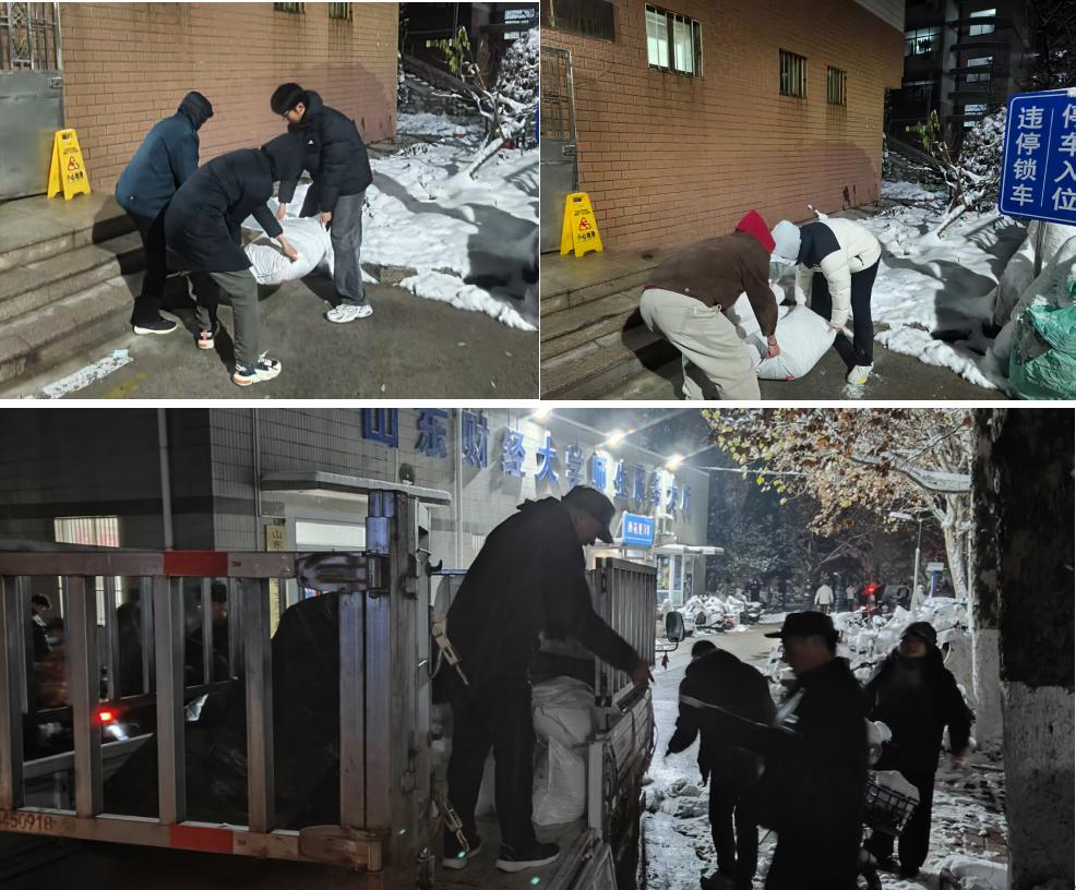 志愿者在各校区提前待命,分工协作,迅速完成搬运与堆放,为后续除雪工作筑牢物资基础。